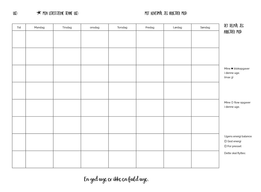 Skemaet er tænkt som en støtte til dig, der ønsker at arbejde mere detaljeret med planlægning. give dine blokopgaver en konkret plads i ugen, uden at miste fleksibiliteten.